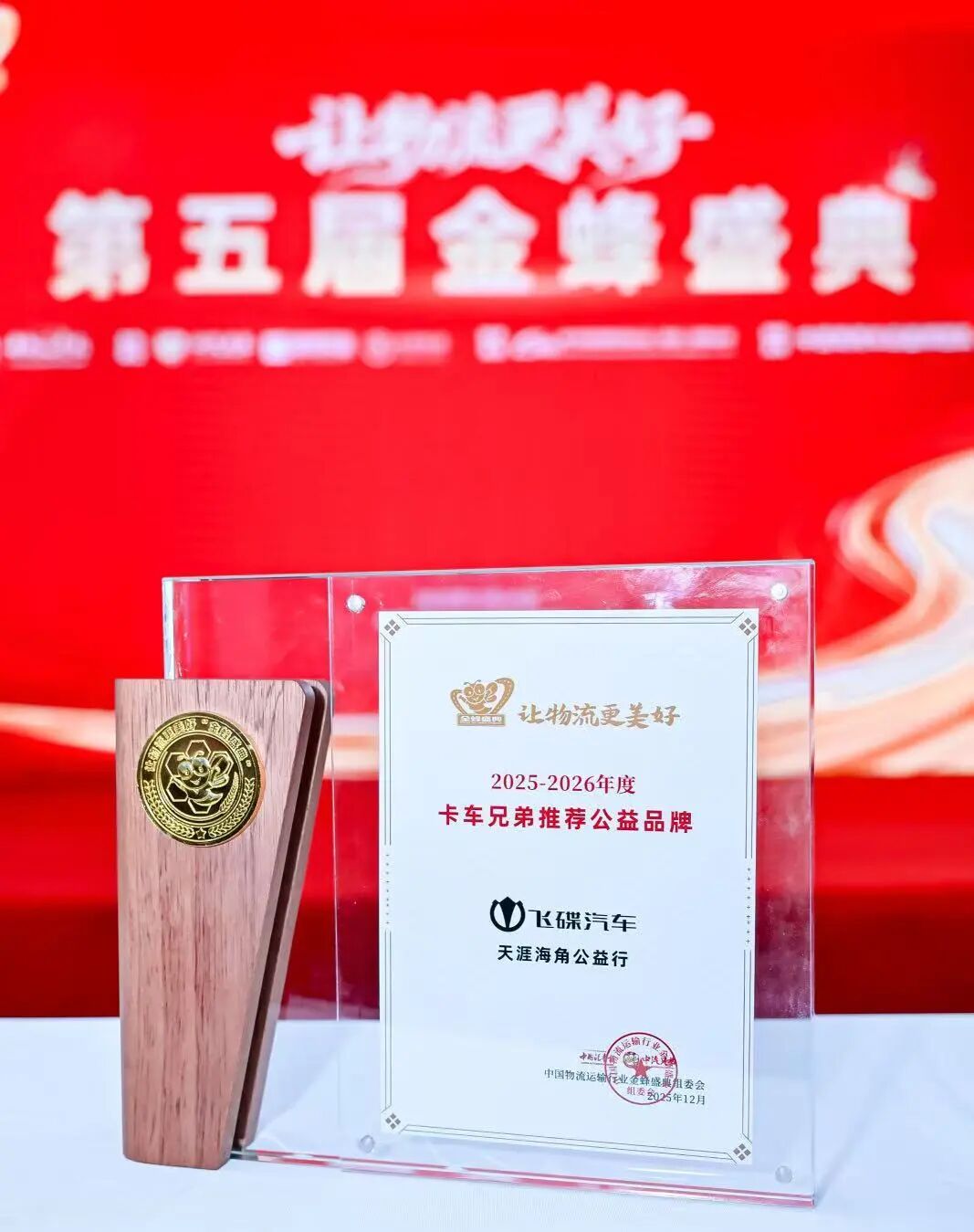 12月26日,由《中国汽车报》社指导,凯瑞认证提供技术支持的第五届“让物流更美好”金蜂盛典在河北雄安举行。飞碟汽车受邀参加,并凭借领先的产品实力与深入人心的公益行动,荣获“金蜂奖——卡车兄弟推荐产品-载货车组(飞碟EW7 MAX版)”及“金蜂奖——卡车兄弟推荐公益品牌”双项殊荣,充分展示了飞碟汽车在商用车领域深受用户信赖、勇担社会责任的价值。
